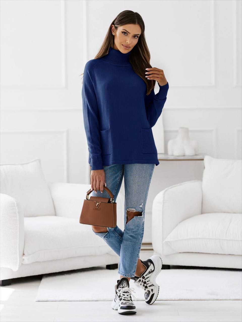Дамски пуловер с поло яка и джобове 98019 син